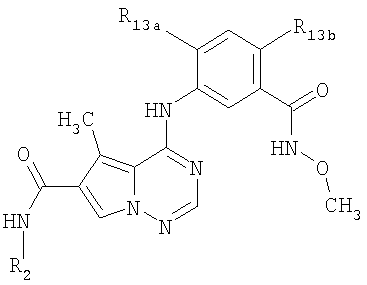 22. Соединение по п.20, которое представляет собой N-Этил-4-[[5-[(метоксиамино)карбонил]-2-метилфенил]амино]-5-метилпирроло[2,1-f][1,2,4]триазин-6-карбоксамид или его фармацевтически приемлемую соль, представляющую собой метансульфонат этого соединения.