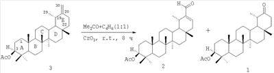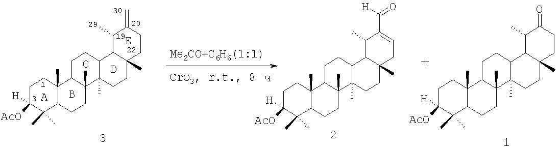 Известен способ (Pai P.P., Kulkarni G.H. Oxidation studies on taraxasterol, taraxasteryl acetate and taraxastenone. Indian J. Chem. 1977. 15B. p.1134-1136) получения 20-оксопроизводных нортараксастерилацетата, в частности 3 -ацетокси-20-оксонортараксастана (1) и 20-альдегидотараксастерилацетата (2) взаимодействием 3 -ацетокси-20-метилентараксастана (тараксастерилацетат) (3) с реактивом Джонса по схеме:
