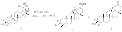 Известен способ (Pai P.P., Kulkarni G.H. Oxidation studies on taraxasterol, taraxasteryl acetate and taraxastenone. Indian J. Chem. 1977. 15B. p.1134-1136) получения 20-оксопроизводных нортараксастерилацетата, в частности 3 -ацетокси-20-оксонортараксастана (1) и 3 -ацетокси-20-гидрокситараксастерил-ацетата (4) взаимодействием 3 -ацетокси-20-метилентараксастана (3) с m-хлорпербензойной кислотой (m-CPBA) по схеме: