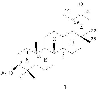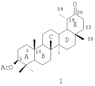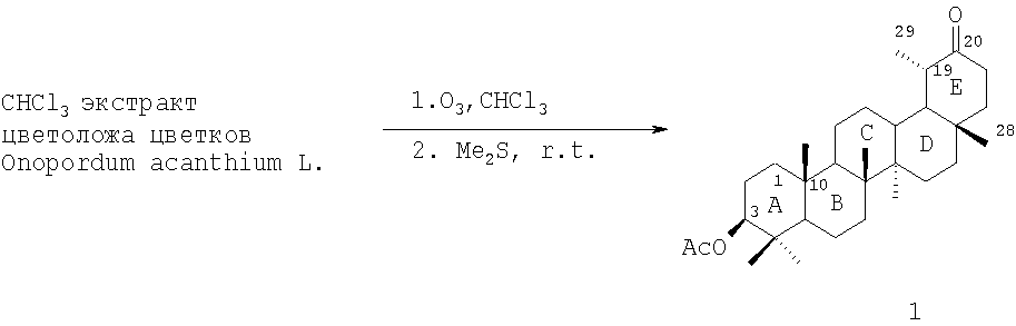 ПРИМЕР 1. Через смесь экстрактивных веществ хлороформного экстракта цветоложа цветков растения татарника колючего Onopordum acanthium L. 6.8 г, содержащую предположительно 1.7 г 3 -ацетокси-20-метилентараксастана (3) (4 ммоль) в 15 мл CHCl3, пропускают озонокислородную смесь при комнатной температуре со скоростью 30 л/ч (производительность озонатора 9.4 ммоль О3 в 1 ч) до поглощения 6 ммоль О3. Контроль реакции проводят по ТСХ и йод-крахмальной пробе на перекиси (в присутствии 2%-ного раствора KI и 1%-ного раствора крахмала). Продукты озонирования восстанавливают Ме2S (6 ммоль) при комнатной температуре в течение 24 ч. Реакционную смесь упаривают на роторном испарителе. Остаток хроматографируют на колонке с силикагелем (элюент – EtOAc-С6Н14, 1:15). Получают 0,75 г (40%) 3 -ацетокси-20-оксонортараксастана (1) в виде белого кристаллическое вещества с т.пл. 250-251,5°С, Rf=0,50.