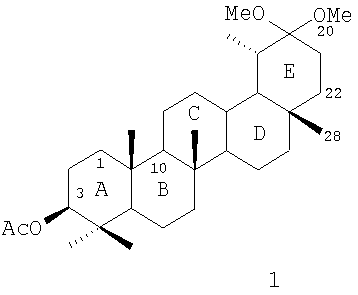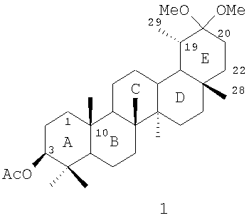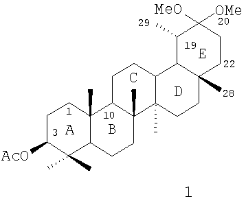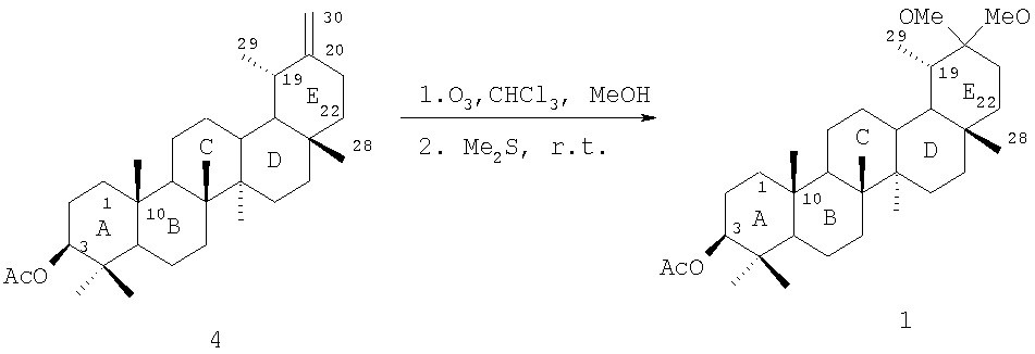 ПРИМЕР 1. Через раствор 0.16 г (0.34 ммоль) 3 -ацетокси-20-метилентараксастана (4) в 5 мл хлороформа, содержащий 0.06 мл МеОН (1.4 ммоль), пропускают озонокислородную смесь при комнатной температуре (производительность озонатора 9.4 ммоль О3 за 1 ч) до поглощения 0.35 ммоль О3. Образовавшуюся смесь перекисных продуктов озонирования (проба на перекиси в присутствии 2%-ного раствора KJ и 1%-ного раствора крахмала) восстанавливают Me2S (0,51 ммоль) при комнатной температуре, в течение 24 ч. Растворитель упаривают в вакууме и получают 0.13 г (68%) 3 -ацетокси-20,20-диметоксинортараксастана (1) в виде белого кристаллического вещества с т.пл. 210-212°С.