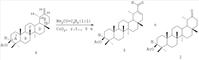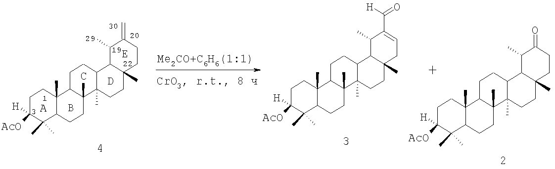 Известен способ (Pai P.P., Kulkarni G.H. Oxidation studies on taraxasterol, taraxasteryl acetate and taraxastenone. Indian J. Chem. 1977. 15B. P.1134-1136) получения 20-оксопроизводных нортараксастерилацетата, в частности 3 -ацетокси-20-оксонортараксастана (2) и 20-альдегидотараксастерилацетата (3) взаимодействием 3 -ацетокси-20-метилентараксастана (тараксастерилацетат) (4) с реактив Джонса по схеме: