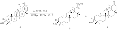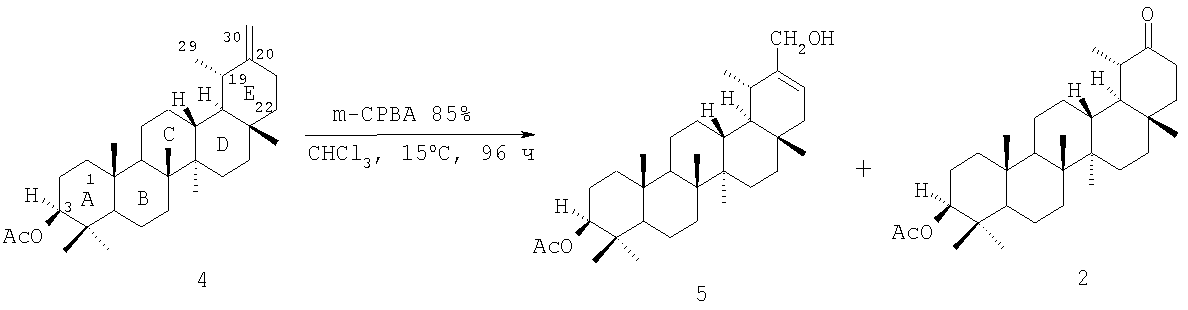 Известен способ (Pai P.P., Kulkarni G.H. Oxidation studies on taraxasterol, taraxasteryl acetate and taraxastenone. Indian J. Chem.1977. 15B. P.1134-1136) получения 20-оксопроизводных нортараксастерилацетата, в частности 3 -ацетокси-20-оксонортараксастана (2) и 3 -ацетокси-20-гидрокситараксастерил-ацетата (5) взаимодействием 3 -ацетокси-20-метилентараксастана (4) с m-хлорпербензойной кислотой (m-CPBA) по схеме: