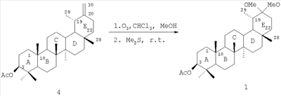 Целевой 3 -ацетокси-20,20-диметоксинортараксастан (1) селективно образуется только в процессе озонолиза. При использовании других окислительных агентов (реактив Джонса, m-хлорпербензойная кислота) образования 3 -ацетокси-20,20-диметоксинортараксастана (1) не происходит. Изменение соотношения исходных реагентов в сторону увеличения концентрации озона по отношению к 3 -ацетокси-20-метилентараксастану (4) не приводит к существенному повышению выхода целевого 3 -ацетокси-20,20-диметоксинор-тараксастана (1).