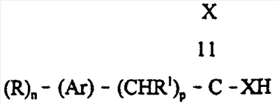где R представляет собой углеводород или, по существу, углеводородный радикал, содержащий, по меньшей мере, четыре алифатических атома углерода, R’ представляет собой водород или С(Х)ХН, n равно целому числу от одного до четырех, Ar представляет собой поливалентный ароматический углеводородный радикал, в целом содержащий до четырнадцати атомов углерода в ароматическом кольце, каждый из Х независимо представляет собой двухвалентную серную или кислородную группу, а р равно нулю или целому числу от одного до шести, при условии, что R и n имеют значения, предполагающие содержание, в среднем, по меньшей мере, восьми алифатических атомов углерода, обеспечиваемых заместителями R для каждой представленной молекулы кислоты. Примерами ароматических радикалов, представленных остатком Ar, являются поливалентные ароматические радикалы, полученные из бензола, нафталина, антрацена, фенантрена, индена, флуорена, бифенила и т.п. Как правило, радикал, представленный Ar, означает поливалентный радикал, полученный из бензола или нафталина, такого как фенилены и нафталин, например метилфенилены, меркаптофенилены, N,N-диэтиламинофенилены, хлорфенилены, дипропоксинафталины, триэтилнафталины и их подобные три-, тетра- и пятивалентные радикалы.