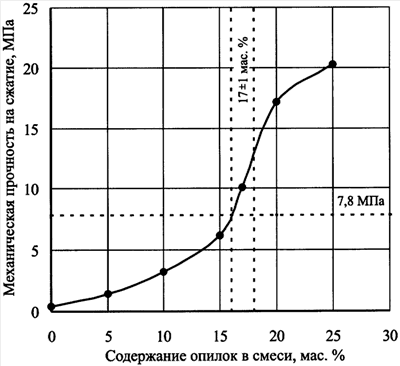 Из таблицы и графика видно, что механическая прочность брикетов на сжатие достигает требуемой ГОСТом величины (7,8 МПа) при содержании в смеси опилок, равном 16 мас.%.