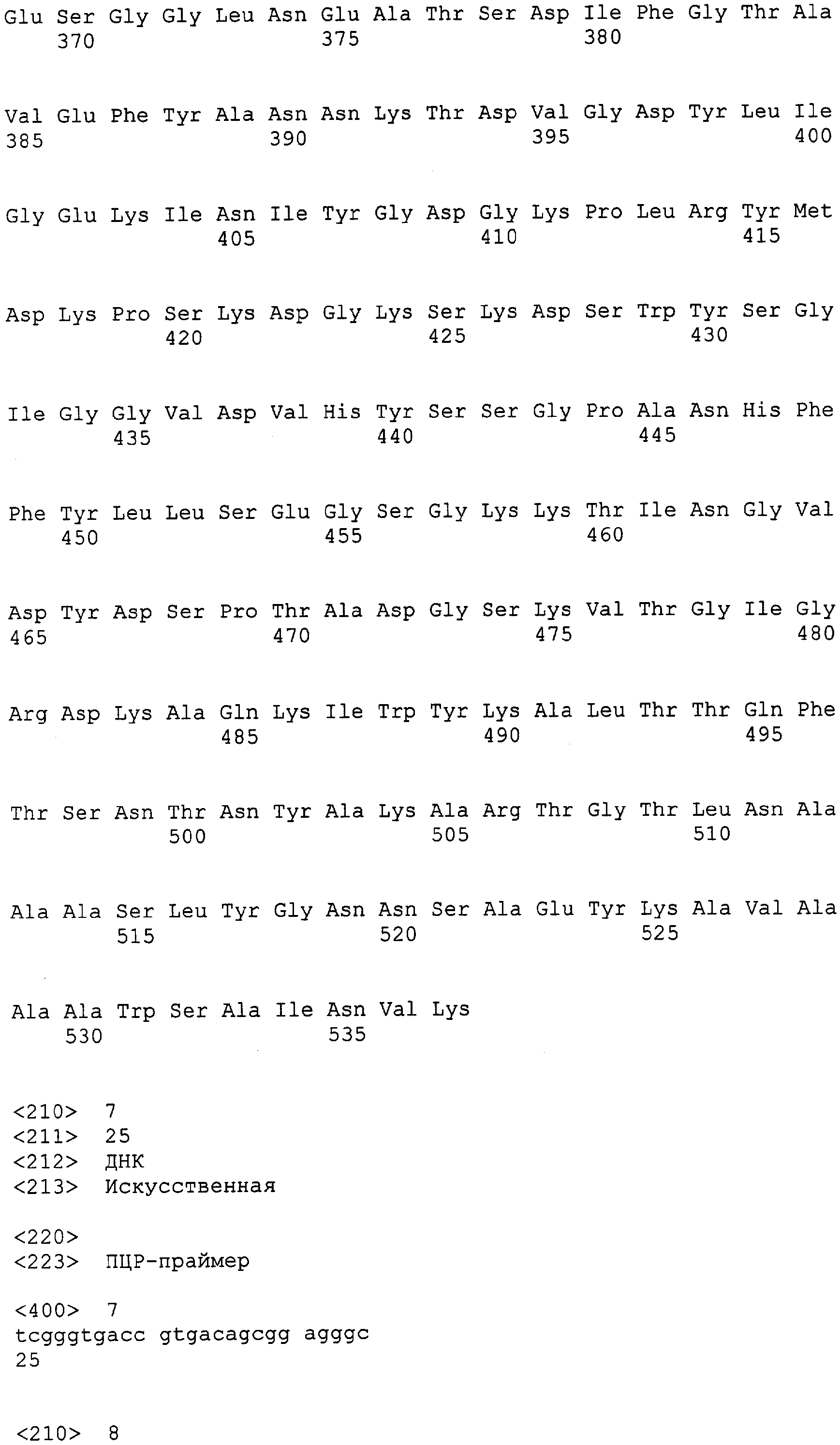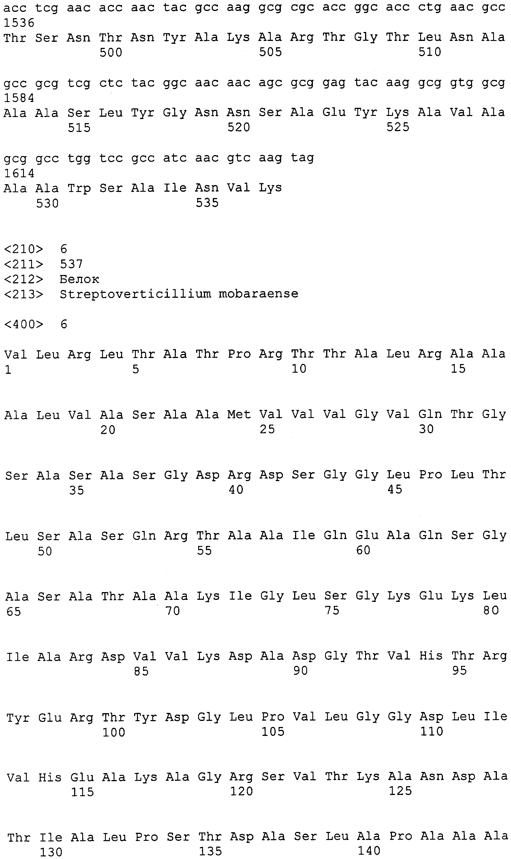 Плазмиду выделяли из штамма, полученного выше, и обозначали как pVSV1. Определяли нуклеотидную последовательность фрагмента, клонированного в pVSV1. Нуклеотидная последовательность данного клонированного фрагмента показана в SEQ ID NO: 5. Предсказывали первичную аминокислотную структуру, кодируемую данным геном, что позволяло определять целую первичную аминокислотную последовательность SVP35, содержащую сигнальную последовательность SVP35, включающую в себя аминокислотную последовательность ранее определенной N-концевой части, и область, признанную проструктурной частью. Полная аминокислотная последовательность SVP35 показана в SEQ ID NO: 6. Предполагается, что аминокислоты № 1-36 аминокислотной последовательности, описанной в SEQ ID NO: 6, относятся к сигнальной последовательности, аминокислоты № 37-216 относятся к проструктурной части и аминокислоты № 217-537 соответствуют зрелой SVP35.