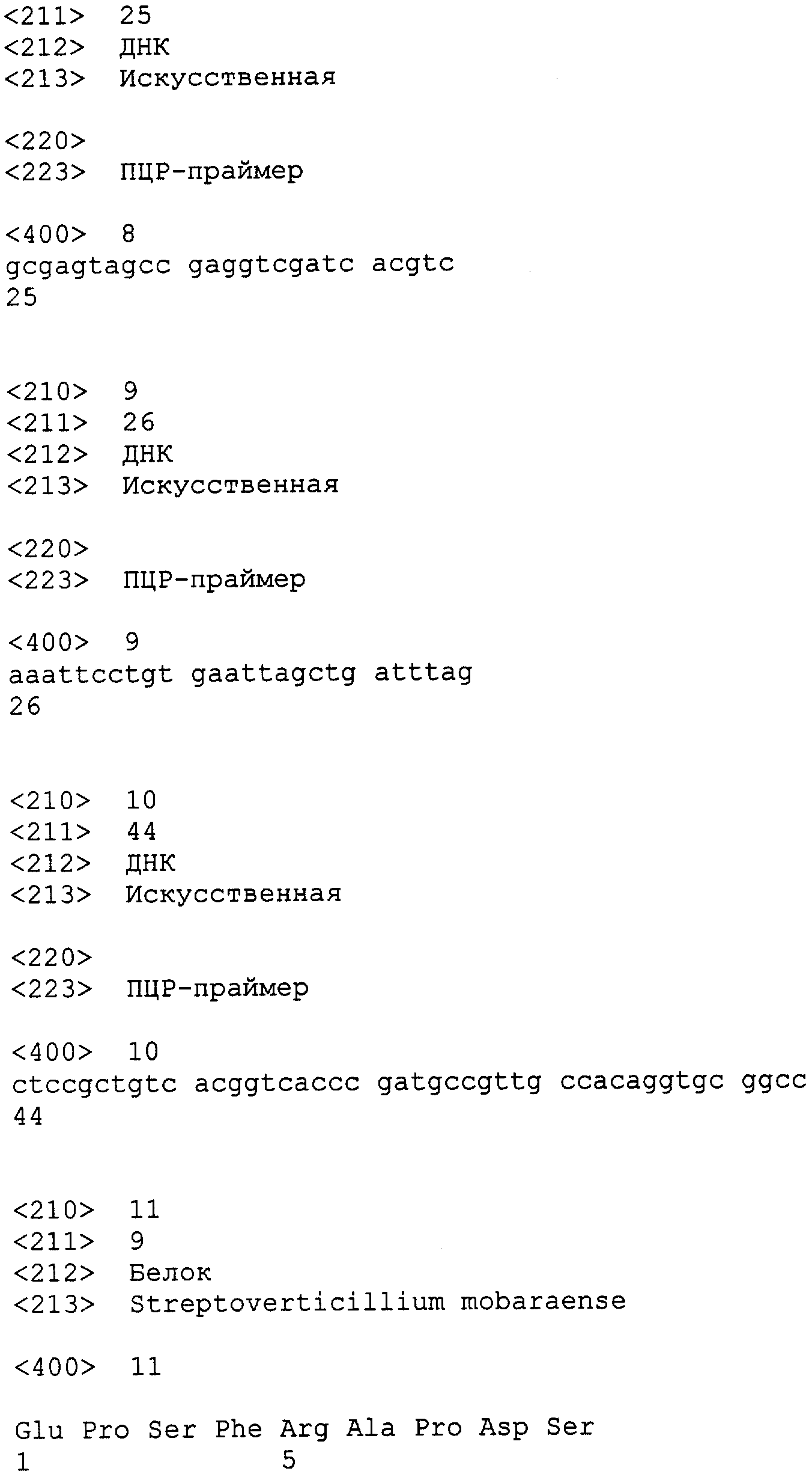 В одном из вариантов осуществления настоящего изобретения ПЦР проводят с использованием хромосомной ДНК Streptomyces coelicolor A3(2) в качестве матрицы для получения зонда. Далее одну полосу размером примерно 8 тыс.п.н., которая гибридизуется с меченными 32P зондами, выявляют в продукте расщепления SphI хромосомной ДНК Streptoverticillium mobaraense IFO13819. Таким образом, хромосомную ДНК Streptoverticillium mobaraense IFO13819, полученную описанным выше способом, расщепляют с помощью SphI, фрагмент, примерно равный 8 тыс.п.н., получают посредством электрофореза в агарозном геле, полученный фрагмент вводят в участок SphI в pUC18, и затем его вводят в компетентные клетки Escherichia coli JM109 с образованием библиотеки. Интересующие клоны могут быть получены путем скрининга образованной библиотеки с использованием синтетического олигонуклеотида в качестве зонда по способам гибридизации колоний, описанным в Molecular Cloning 2nd edition (выше), и путем отбора штамма, который несет плазмиду, содержащую генный фрагмент SVP35, клонированный в плазмиду. Плазмиду, полученную из данного штамма, обозначают здесь как pVSV1. Анализируют последовательность нуклеотидов фрагмента, клонированного в pVSV1, предсказывают первичную аминокислотную структуру для подтверждения того, что данный фрагмент кодирует ранее установленную N-концевую аминокислотную последовательность. Таким образом, подтверждают, что полученный ген представляет собой ген, кодирующий SVP35.