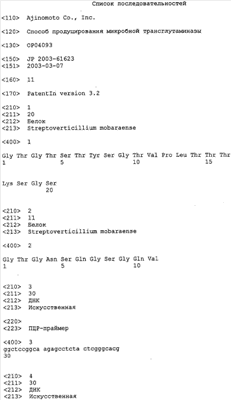 Поскольку данные трансглутаминазы, однако, продуцировались путем очистки из культур, таких как культуры описанных выше микроорганизмов, имели место проблемы в плане количества и эффективности, и тому подобного. Затем, в качестве способа эффективной секреции гетерологичных белков, был разработан способ, в котором в качестве хозяина выбрана коринеформная бактерия, где белок слияния, содержащий трансглутаминазу, присоединяли ниже домена сигнального пептида коринеформной бактерии, и трансглутаминаза эффективно секретировалась с получением ее высокого выхода (WO 01/23591). В данном исследовании описан способ, в котором MTG секретируется в неактивной форме как протрансглутаминаза (здесь и далее указана как «про-MTG»), в которой проструктурная часть присоединена к MTG, и затем проструктурная часть про-MTG отщепляется протеазой с преобразованием ее в трансглутаминазу, имеющую активность, а также способ, в котором активная трансглутаминаза продуцируется непосредственно в культуральную среду в требуемом и достаточном количестве путем совместной экспрессии с SAM-P45, представляющей собой сериновую протеазу, происходящую из актиномицетов, в коринеформной бактерии, продуцирующей про-MTG.