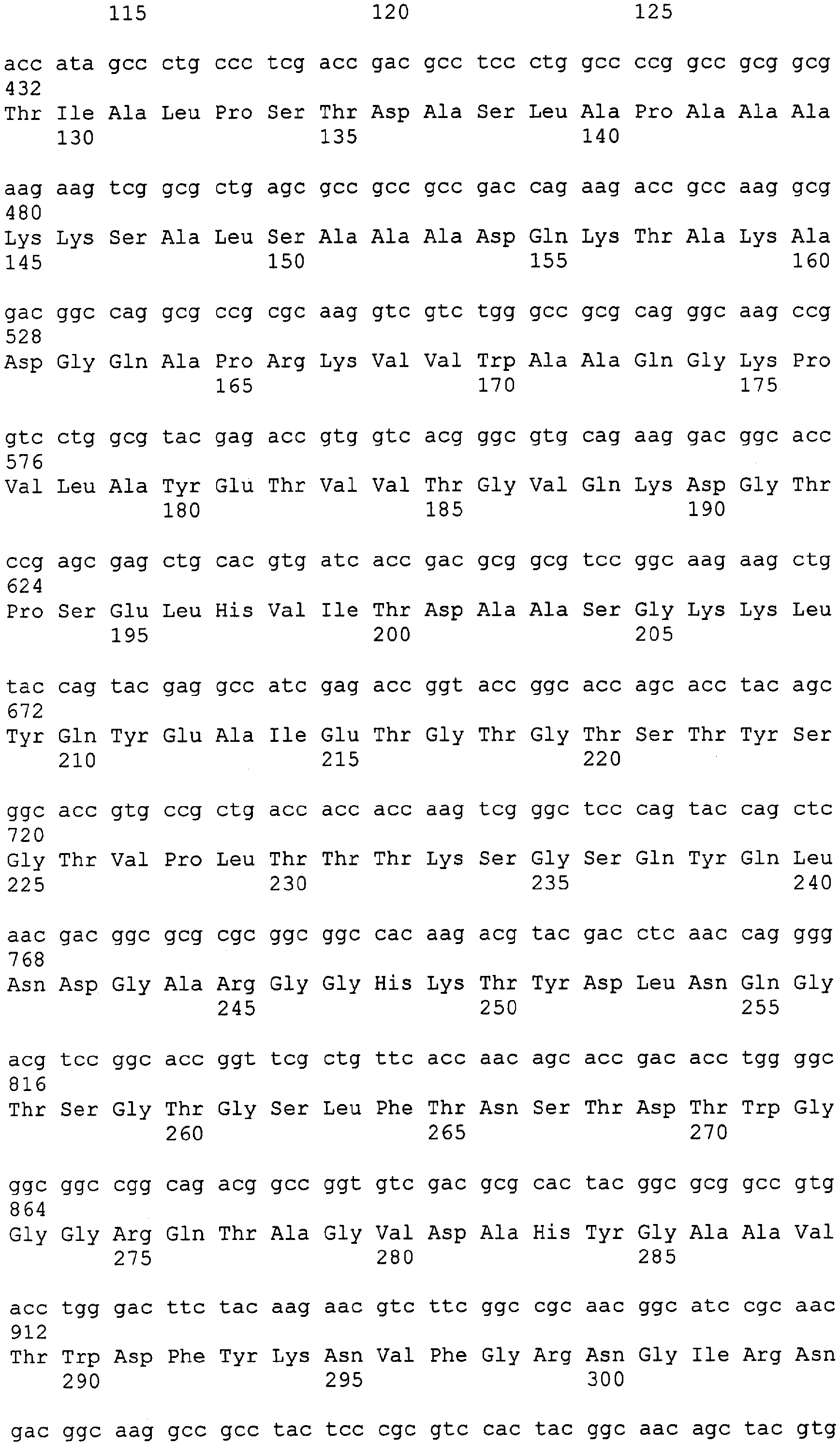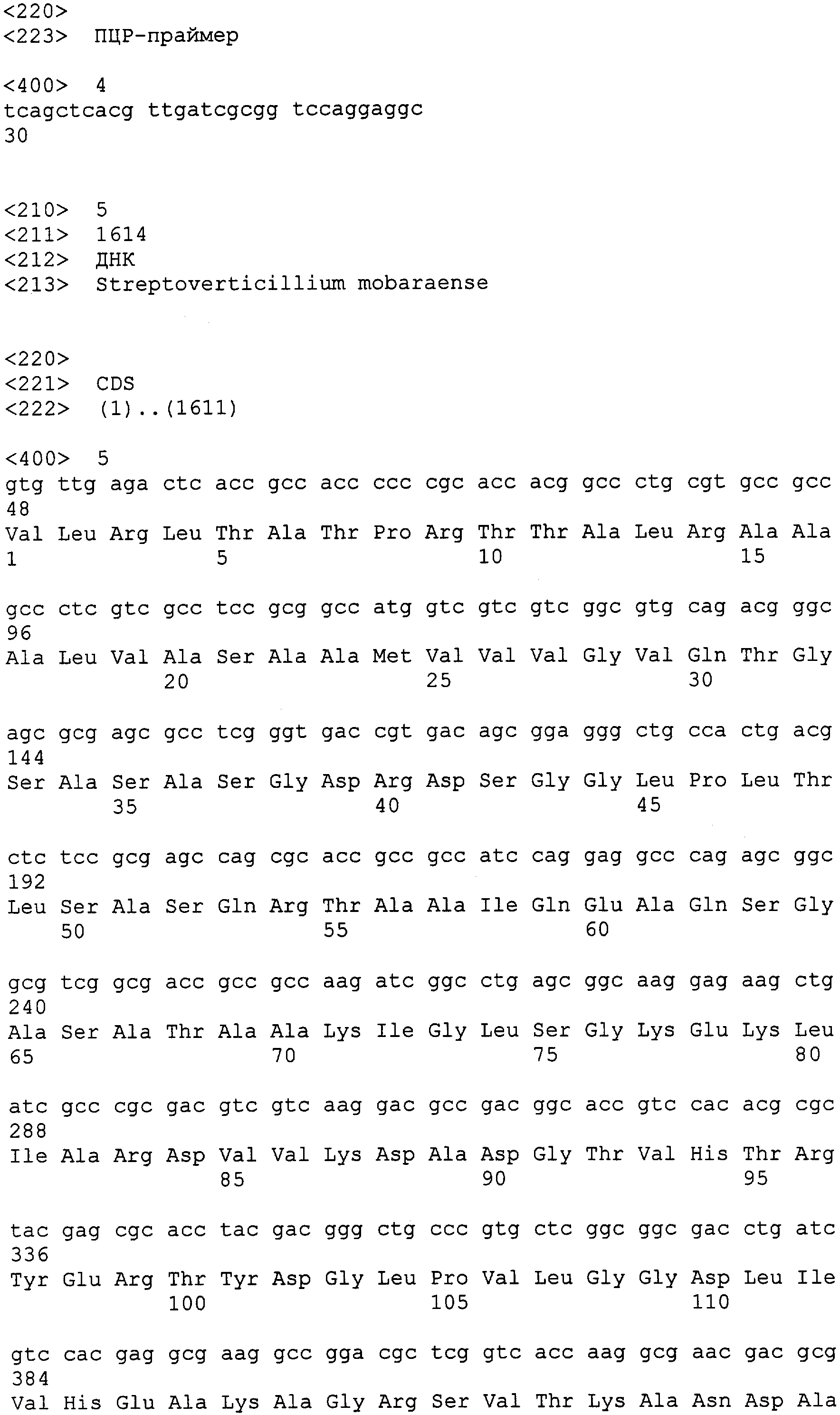 Данная информация может использоваться для синтеза подходящего праймера для ПЦР и получения зонда для получения нейтральной металлопротеиназы по настоящему изобретению. Например ген протеазы из актиномицетов, который, как ожидается, характеризуется гомологией на основе результатов поиска гомологии с N-концевой аминокислотной последовательностью, например ген металлопротеазы (GenBank/EMBL/DDBJ CAB76001) из Streptomyces coelicolor, может подвергаться ПЦР с использованием ДНК актиномицетов, полученной по способу Saito and Miura [Biochem. Biophys. Acta, 72, 619 (1963)], в качестве матрицы, для амплификации фрагмента гена, кодирующего данную протеазу. Амплифицированный фрагмент может использоваться в качестве зонда.