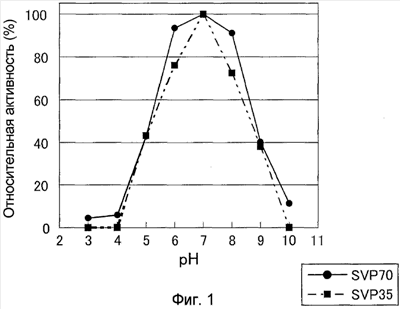 В 0,15 M буфере GTA (уравновешенном 3,3-диметилглутаровой кислотой, трис-(гидроксиметил)аминометаном, 2-амино-2-метил-1,3-пропандиолом) от pH 3 до pH 10, SVP35 позволяли взаимодействовать с Gly-Pro-Ser-Phe-Arg-Ala-Pro-Asp-Ser в качестве субстрата при 30°C в течение 10 минут. В результате было выявлено, что оптимум pH для SVP35 составлял около 7,0, и что если активность при pH 7,0 определяли как 100%, SVP35 имела активность 70% или более при pH 6,0-8,0 и активность 80% или более при pH 6,5-7,5 (см. фиг.1).