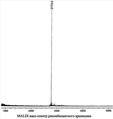 Для определения молекулярной массы ареницина используют MALDI (matrix-assisted lazer desorption ionization) масс-спектрометрический анализ на приборе VISION 2000 (ThermoBioAnalysis, OK). В качестве матрицы используют 0,15 М 2,5-дигидроксибензойную кислоту в смеси, содержащей 25% метанол и 0,1% трифторуксусную кислоту. Образец облучают УФ-лазером с длиной волны 337 нм и максимальной энергией 250 мкДж в импульсном режиме с частотой 3 нс. При масс-спектрометрическом исследовании ареницина (мощность лазера – 45%, число лазерных ударов – 69) получен пик с m/z 2772 (см. чертеж), соответствующий молекулярному иону природного ареницина (расчетная молекулярная масса составляет 2772,35 Да).