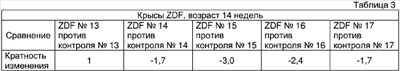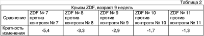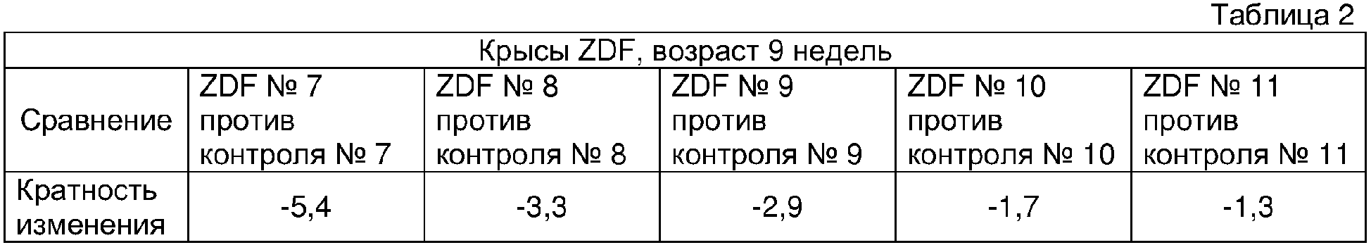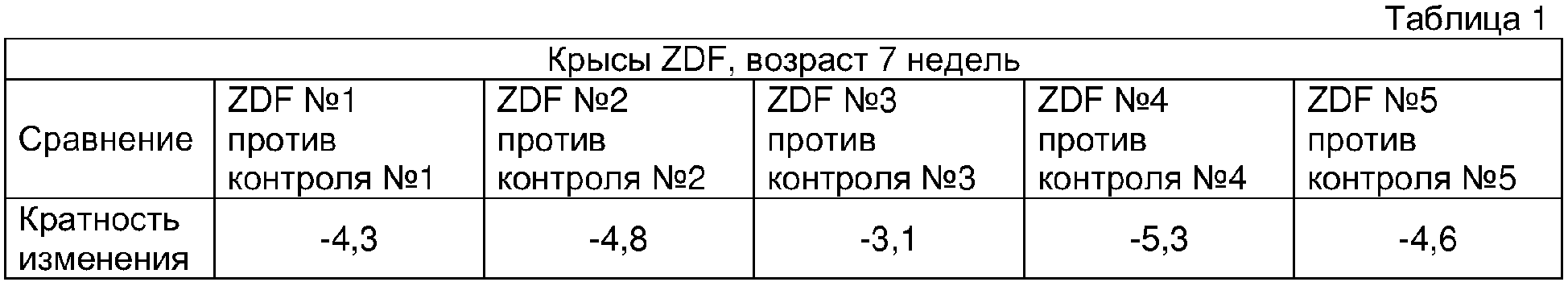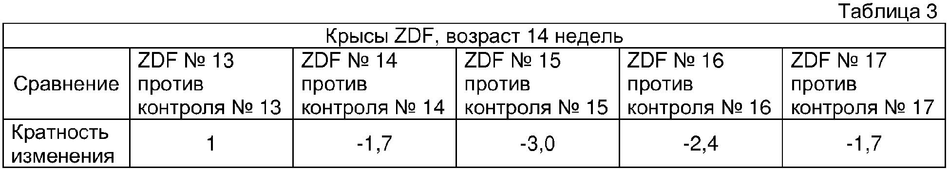 Сбор жировой ткани придатков яичка, выделение РНК и эксперименты Affymetrix проводили, как описано в эксперименте 1. Анализ данных включал сравнение данных об экспрессии в образцах, полученных от контрольных животных без ожирения с необработанными крысами ZDF, а также сравнение данных об экспрессии, полученных от животных ZDF, обработанных розиглитазоном с необработанными животными ZDF. Анализ данных, включающий подсчет кратности изменений и оценку статистической значимости данной кратности изменений, проводили с применением принадлежащего авторам настоящего изобретения программного обеспечения, разработанного в Aventis pharmaceuticals. Кратность изменений экспрессии генов для PIM-3 анализировали с применением спецификатора Affymetrix AF086624_S_AT. Результаты данного анализа подытожены в следующих таблицах 8a и 8b.