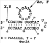 Ряд конъюгатов “аптамер-краситель” (Фиг.2) были синтезированы и деблокированы, как описано ранее20-23. Флуоресцеин-фосфорамидит и акридин-фосфорамидит были использованы в синтезе аптамеров с внутренней меткой, а аптамеры с концевой меткой были генерированы с использованием 5′-флуоресцеин-фосфорамидита. Деблокирование конъюгатов “РНК-аптамер-краситель” осуществляли в соответствии с модифицированной процедурой, описанной Wincott et al23. В первой стадии деблокирования смолы суспендировали в смеси NH4OH:EtOH (3:1) в течение 13 часов при комнатной температуре, а не в течение 17 часов при 55°С. Аптамеры очищали с помощью электрофореза в полиакриламидном геле, элюировали 0,3 М NaOAc в течение ночи при 37°С и осаждали этанолом. Аптамеры ресуспендировали в 50 мкл Н2O, а затем количественно оценивали путем измерения А260 с использованием коэффициента экстинкции 0,025 мл·см-1·мкг-1 для РНК и 0,027 мл·см-1·мкг-1 для ДНК.