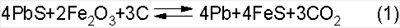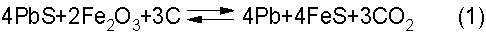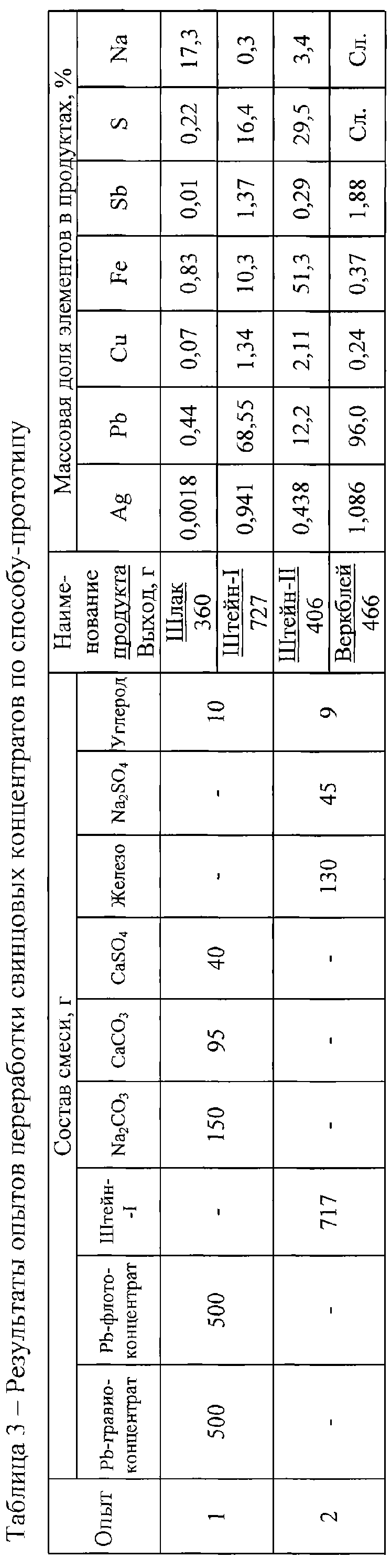 Компоненты шихты взвешивали на лабораторных весах и усредняли, готовую смесь помещали в графитошамотовый тигель ТГ-10. Тигель с шихтой загружали в шахтную печь сопротивления с карбидокремниевыми электронагревателями и выдерживали при температуре 1250°С в течение 90 минут. По окончании выдержки тигель с расплавом охлаждали в печи со скоростью 10-20 градусов в час путем регулируемого понижения токовой нагрузки на нагревателях. По достижении температуры в камере печи 300°С тигель выгружали и охлаждали до комнатной температуры. Продукты плавки – шлак, штейн и веркблей – извлекали из тигля, разделяли по границе ликвации, взвешивали и анализировали на содержание элементов пробирным и химическим методами анализа. Данные по составу шихты, выходу продуктов плавки, содержанию в них серебра, железа и цветных металлов приведены в таблице 2. Куски штейна массой 361,0 г помещали в лабораторный реактор и заливали водой в соотношении Т:Ж=1:1. Штейн в течение 30÷40 минут диспергировался, превращаясь в дисперсный осадок черного цвета. Полученную пульпу перемешивали, переносили в лабораторную шаровую мельницу и измельчали до крупности 95÷97% класса минус 0,074 мм. Пульпу переносили в камеру лабораторной установки флотации, обрабатывали серной кислотой до снижения рН среды от 12 до 6,5 и агитировали в течение 15 минут. Подготовленную пульпу при содержании твердого около 40% обрабатывали в течение трех минут бутиловым ксантогенатом калия из расчета 80÷130 г на 1 т питания и вспенивателем Т-80 из расчета 10÷20 г на 1 т питания, после чего проводили флотацию в течение трех минут. Полученный пенный продукт сушили. Выход пенного продукта составил 54,8 г, по данным пробирного и химического анализа флотоконцентрат штейна содержал, в мас.%: 1,314 серебра; 42,0 свинца; 30,4 железа; 17,2 серы; 1,12 меди; 0,13 сурьмы. Хвосты флотации пульпы перерабатывали на концентрационном столе СКО-0,5 со шламовым исполнением деки. Полученные продукты сушили и взвешивали. Гравитационный концентрат массой 19,2 г содержал, мас.%: 2,969 серебра; 78,0 свинца; 9,4 железа; 5,3 серы; 0,27 меди; 0,05 сурьмы. Хвосты стола массой 273,0 г содержали, мас.%: 0,051 серебра; 1,65 свинца; 59,4 железа; 33,6 серы; 2,97 меди; 0,32 сурьмы. Флотационный и гравитационный концентраты опыта 1 смешали с исходными свинцовыми концентратами, флюсами и добавками и проплавили по методике опыта 1. Данные по составу шихты опыта 2, выходу продуктов плавки и содержанию в них серебра, железа и цветных металлов приведены в таблице 2.