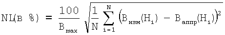Нелинейность NL петли гистерезиса после отжига определяется как среднеквадратичное отклонение петли гистерезиса в координатах B-H (измеренное на ленте длиной 10 см) относительно линейной аппроксимации петли гистерезиса. То есть, говоря точнее,