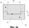 Зажимное приспособление 30 для отжига подробно описано со ссылкой на фиг.2. Как показано на фиг.2а (поперечное сечение) и 2b (вид сбоку), оно состоит из верхней части 32 и нижней части 33, а также канала 31, по которому лента транспортируется через печь. Канал 31 отжига имеет ширину W, обычно лишь слегка превышающую ширину ленты, и высоту Z, которая должна, по меньшей мере в несколько раз, превышать толщину ленты, но, предпочтительно, составляет по меньшей мере около десятой доли миллиметра даже для очень тонких лент. Последнее условие обусловлено практическими причинами, в частности механической обработкой зажимного приспособления, легкостью вставления ленты в зажимное приспособление и очисткой зажимного приспособления. Обычно для ленты толщиной 20-30 мкм, например аморфной металлической ленты, зазор Z в канале предпочтительно составляет более примерно 0,2 мм.