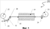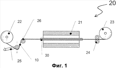 На фиг.1 схематически показано устройство 20 отжига. Устройство отжига включает в себя печь 21 и подающую и приемную бобины 22, 23 с противоположных сторон печи. Непрерывную ферромагнитную ленту 10 разматывают с подающей бобины 22, транспортируют через печь 21 и наматывают на приемную бобину 23. При транспортировке ленты через печь ее траектория поддерживается, по существу, прямолинейным зажимным приспособлением 30 для отжига. Лента захватывается между парой роликов 24, которые протягивают ленту 10 через печь. Ролик 26 поддерживает ленту так, чтобы она поступала в печь прямолинейной настолько, насколько это возможно.