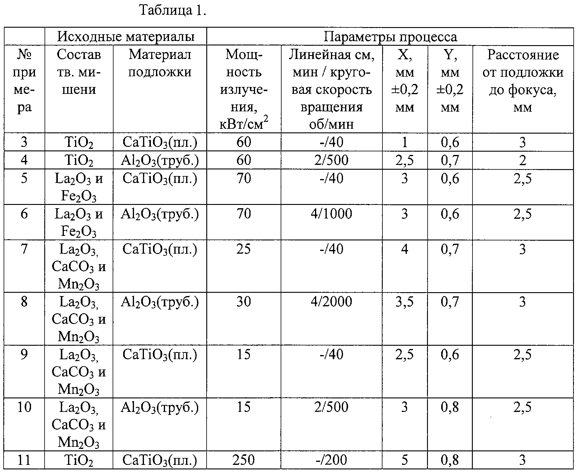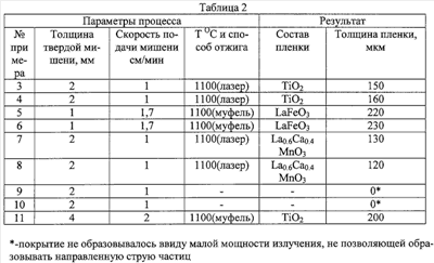 Аналогичен примеру 1 и отличается величиной смещения мишени от фокуса, типом отжига, мощностью излучения и подробно описан в таблице 1, 2.