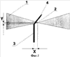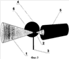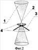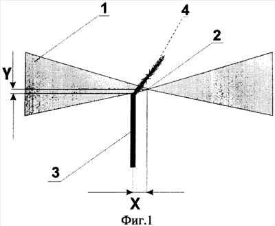 Для получения узконаправленной устойчивой струи испаряемого материала необходимое смещение мишени от фокуса по оси (X), совпадающей с направлением излучения, составляет от 1 до 5 мм, а по оси (Y), перпендикулярной первой оси, не более 1 мм. При этом возможно изменение направления распространения струи за счет изменения положения фокуса 2 лазерного излучения относительно твердой мишени 3, как показано на фиг.2. Схема движения струи зависит от положения твердой мишени 4. Отклонение мишени от фокуса лазерного излучения на большие, чем указанные расстояния приводит к исчезновению струи частиц испаряемого материала. При использовании смещения мишени от фокуса излучения происходит создание струи выбиваемых с поверхности мишени частиц с высокой энергией, которая позволяет осуществлять нанесение на большие поверхности путем перемещения как подложки, так и фокусирующего устройства лазера с мишенью.