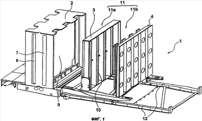 Из чертежа понятна структура передвижных компонентов в виде стойки 3 и крышки 4 модуля, выполненный в виде тележек, каждую из которых можно перемещать по направляющим 12.