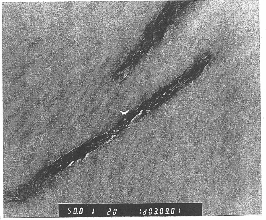 На чертеже показано сечение вытянутого образца полностью ароматического полиамидного волокна настоящего изобретения. На чертеже наблюдается множество областей, имеющих высокую плотность распределения глиноземного минерала со слоистой структурой, которые статистически распределены в форме штапельного волокна в сечении волокна. Эти области наподобие штапельного волокна вытянуты вдоль направления оси волокна.