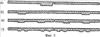 Чтобы исключить возможность соскальзывания многослойной оболочки со скала в случае некоторой неперпендикулярности продольной оси скала нитям движущейся основы, на наружной поверхности скала выполнены кольцевые выемки 19 (или выступы 20), которые совмещены при наличии незначительного зазора с кольцевыми выступами 21 (или выемками 22) на внутреннем слое 8 оболочки 3 (фиг.4). Число выступов составляет 1 (фиг.5а) по середине оболочки, 2 (фиг.5б) по ее краям или более (фиг.5в, г). При прочих равных условиях, чем меньше выступов, тем они выше и шире (фиг.5а) и наоборот. Вид выступов – впадин зацепления внутреннего слоя оболочки со скалом, имеющим антифрикционное покрытие 9, может быть различным: прямоугольным, треугольным, трапециевидным и т.д.