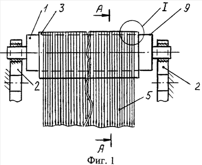 Наружный слой 6, контактирующий с нитями 5 (фиг.2), выполнен фрикционным с целью исключения относительного скольжения между оболочкой и нитями. При этом электризация нитей 5 в зоне скала сведена к минимуму. Выполнение слоя 6 упругим позволяет для каждой нити увеличить поверхность ее контакта со слоем 6 оболочки (фиг.3) и таким образом уменьшить износ нитей в зоне скала.