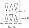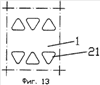 Отверстия могут иметь и треугольную форму, например в виде прямоугольного 19 (фиг.11), равнобедренного 20 (фиг.12) или равностороннего 21 (фиг.13) треугольников, а также иную форму. Другим вариантом служит замена отверстий перфорации вмятинами на стенках трубы с сохранением их формы и расположения, включая форму клина.