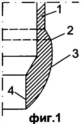 На фиг.1 – с внешней стороны трубы 1 выполнено утолщение 2 с плавной параболической поверхностью 3, идущей от острия наконечника, а с внутренней стороны трубы 1 выполнено утолщение 4 с прямой поверхностью.