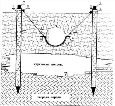 Геологические службы обнаруживают карстовые провалы грунта, вскрывают трубопровод 2 в том месте, где зафиксирована карстовая полость. Далее установкой пробуривают скважины до глубины залегания некарствующих горных пород, чтобы выполнить буронабивные сваи 1. Буронабивные сваи 1 выполняют попарно с определенным шагом по обе стороны трубопровода 2 таким образом, чтобы оголовок 4 сваи 1 находился выше уровня поверхности земли. Шаг определяется расчетом исходя из величины нагрузки и грунтовых условий. Размер сваи 1 (длина, диаметр, армирование), расстояние между сваями 1 определяется расчетом в каждом конкретном случае. При большом опрокидывающем моменте для того, чтобы не увеличивать диаметр и длину сваи 1, возможно применение анкерных креплений. Затем под трубопровод 2 укладывают металлический ложемент 3, на котором предварительно можно установить петли 6. В качестве металлического ложемента 3 используют половину трубы большего диаметра, чем диаметр трубопровода 2. Далее берут вытянутый стальной трос 5, пропускают его через петли 6 металлического ложемента 3, огибая трубу. Концы стального троса 5 крепят к оголовкам 4 свай 1 при помощи натяжных муфт 7. Натягивают стальной трос 5 до тех пор, пока трубопровод 2 не приобретает проектное положение. Диаметр троса 5 определяют расчетом исходя из нагрузки. Защита троса 5 от атмосферных воздействий осуществляется мастиками. Далее засыпают трубопровод 2 грунтом.