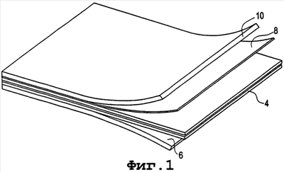 Ламинаты, получаемые прямым прессованием (ЛПП), сами по себе хорошо известны. Известные ламинаты, получаемые прямым прессованием, обычно изготавливают из основной доски 4 (см. Фиг.1), являющейся древесноволокнистой или древесностружечной плитой средней или высокой плотности. Кроме того, один или большее число листов 6 крафт-бумаги (для большей ясности на Фиг.1 показан только один лист бумаги), пропитанный выбранными полимерами, укладывают поверх и/или снизу основной доски 4. Кроме того, декоративный лист 8 целлюлозной бумаги толщиной около 0,15 мм, пропитанный раствором меламина, укладывают поверх листа крафт-бумаги. Поверх декоративного листа 8 целлюлозной бумаги укладывают один или большее число защитных покровных листов 10. Покровный лист изготавливают из высокопрочной бумаги с корундом (Al2O3), пропитанной в растворе меламина. Между листом декоративной целлюлозной бумаги и основной доской можно также располагать различные слои бумаги.