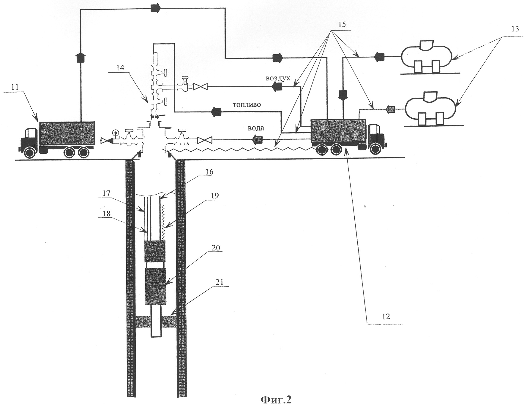 Наземное оборудование включает в себя компрессорный (11) и технологический (12) блоки, расходные емкости по воде и топливу (13), скважинную арматуру (14), трубопроводы (15), связывающие все наземные блоки, компрессорный блок – самостоятельный технологический агрегат, комплектуемый по заказу (фиг.2). Технологический блок включает в себя системы подачи топлива и воды в парогазогенератор, приборы контроля и автоматического управления процессом выработки парогазовой смеси, запорно-регулирующую арматуру и трубопроводы воды, топлива, воздуха для крепления парогазогенератора в транспортном положении; скважинного оборудования: трубопроводов подачи к парогазогенератору воздуха (16),топлива (17), воды (18), кабеля подачи напряжения к запальному устройству форкамеры и термометрии (19), парогазогенератора (20), термостойкого пакера (21).