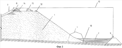 По мере намыва, отвалообразователь 8 передвигают. Для установки отвалообразователя 8 на новое место производят отсыпку насыпи 14 из ранее намытого массива 11.