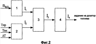 При запуске двигателя газотурбинной установки на базе двигателя ПС90А блок 1, на вход которого поступает сигнал о величине текущей частоты вращения ротора газогенератора nвд, формирует задание на величину и подает выходной сигнал I1 на первый вход блока 3. На входы блока 2 поступает информация о величинах температуры воздуха на входе в двигатель Твх, температуры продуктов сгорания Тпр и «уставки» T.