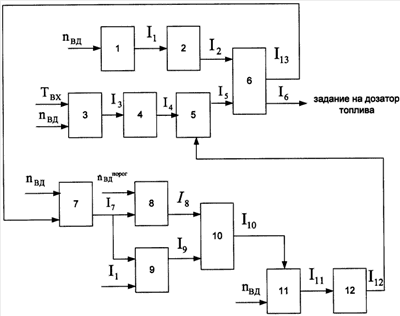 На вход блока 1 поступают данные о текущей величине nВД. Выходной сигнал I1, соответствующий текущей величине ускорения , поступает на вход блока 2. Выходной сигнал I2 соответствует величине расхода топлива, необходимой для поддержания требуемой величины ускорения .