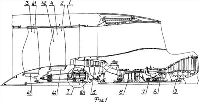 Полезная мощность от турбины низкого давления 9 через редуктор 10 с фиксированным передаточным отношением на роторах 3 и 4 поступает на вентилятор 2, лопатки 41 и 42 которого установлены неподвижно относительно дисков 43 и 44 первого 3 и второго 4 роторов противоположного вращения.