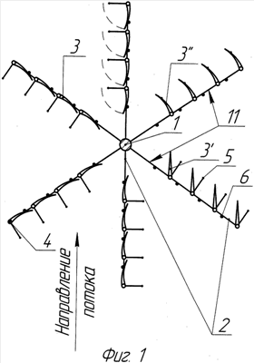 Благодаря тому, что лопатки 3 (см. фиг.2) выполнены в виде замкнутого эластичного материала 7, плотно охватывающего без возможности осевого перемещения из-за упоров 8 утолщенную ось 4 и отжатую пружинной проволокой 9 от оси вертикальную жесткую кромку 10, лопатка 3 имеет каплевидную форму 3′ (см. фиг.1) в поперечном сечении в свободном состоянии или при равномерном воздействии потока с двух сторон, когда лопатка 3′ находится между фиксаторами 5 и 6. Такая форма лопатки 3′ с располагаемой навстречу потоку осью 4 имеет наименьший коэффициент сопротивления потоку (на практике коэффициент сопротивления Сх 0,08-0,12), при этом турбулентные завихрения, создаваемые лопатками 3, минимальны. Для исключения смещения эластичного материала 7 в поперечном направлении относительно утолщенной оси 2 он может быть зафиксирован относительно этой оси 4.