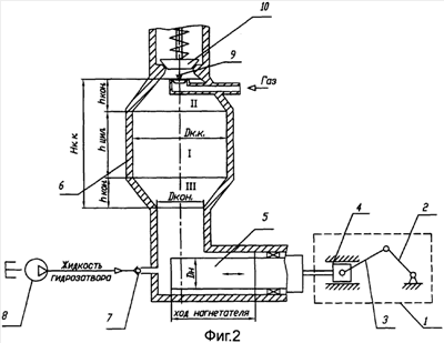 В этом случае в момент начала открытия нагнетательного клапана «зеркало» (поверхность) гидрозатвора находится в конической зоне компрессионной камеры, что определяет конфузорное течение нагнетаемой среды, минимизирующее возможные газодинамические воздействия на гидрозатвор, приводящие к насыщению его газом за счет волновых явлений и «захлестывания» отдельных областей газа жидкостью гидрозатвора.