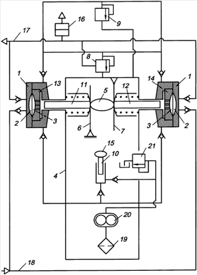 При ходе всасывания давление в приводных камерах 3 падает до давления во всасывающей магистрали 18. Рабочие камеры 2 заполняются газом, происходит процесс всасывания. Для компенсации утечек жидкости из приводных камер 3 и создания избытка жидкости, необходимой для нормальной работы компрессора, существует подкачивающий насос 10, осуществляющий подачу жидкости в приводные камеры 3 оппозитно расположенных мембранных блоков. На всасывание подкачивающего насоса 10 жидкость подается циркуляционным насосом 20 мембранного компрессора, имеющего приемный фильтр 19. От перегрузки циркуляционный насос защищается редукционным клапаном 21.