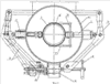 Полудиффузоры 23 и 30 установлены на цилиндрических шарнирах 22, закрепленных сваркой на конической части отводящей водяной магистрали 9. Полусопла 4, 10 имеют кронштейны 25 с пазами 26. Полудиффузоры 23,30 имеют кронштейны 27 со штифтами 28, входящими без зазоров в пазы 26 кронштейнов полусопел.