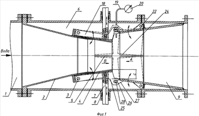 Указанное давление, регистрируемое, например, манометром 20 или датчиком давления, отбирается на уровне среза полусопел с помощью трубки 19. С помощью тяг 7 изменяют угол наклона полусопел 4 и 10 по отношению к направлению основного потока (к оси полусопел), вследствие этого изменяется как площадь критического сечения водяного сопла, так и потери напора в нем, что позволяет эффективно регулировать давление в зоне разрежения и поддерживать его постоянным.