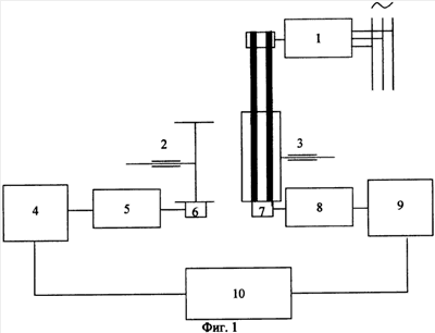 Получаемая при торможении асинхронным генератором энергия через преобразователь 10 передается на электродвигатель 9, который соединен с входным валом редукторного узла 8, на выходном валу которого установлен фрикционный ролик 7, контактирующий с маховиком 3. Привод редукторного узла осуществляется с помощью прижимающего пневмоцилиндра, работающего синхронно с прижимающим пневмоцилиндром фрикционного ролика 6.