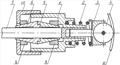 Накидной гайкой 10 освобождается стопорная втулка 8 и цанги 6 и 7. Все устройство перемещается в сторону передачи 11 до тех пор, пока стержень 5 с подпружиненным штоком 3 и натяжным шкивом 4 не займут крайнее правое положение, при этом пружина 2 сжимается. Цанги 6 и 7 расклиниваются по стержню 5 стопорными втулками 8 и 9 под действием накидной гайки 10, при этом корпус 1 фиксируется. При ослаблении передачи 11 пружина 2 перемещает шток 3 с натяжным шкивом 4 – происходит натяжение.