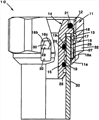 Первый внутренний элемент 14 содержит цилиндрический сегмент 15, который проходит почти по всей осевой длине соединения 10, и кольцевой сегмент 16 более широкого сечения, имеющий наружную резьбу 17, и который также действует как имеющее опорную поверхность средство для размещения второго внутреннего элемента 18.