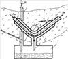 Наиболее опасными участками в части образования конденсатных пробок и замерзания конденсата является его восходящий участок и колено. Для предотвращения образования конденсатных пробок в газопроводе необходимо непрерывное удаление конденсата, а для устранения замерзания его осуществляется соответствующее поддержание температурного режима. Конденсат, образующийся в восходящем 1 и нисходящем 2 участках за счет охлождения стенок газопровода в промерзлом грунте, стекает под действием силы тяжести по соединительному колену 3 через сливной конденсатопровод 5 в накопительную емкость 7, которая расположена ниже уровня промерзания грунта. В результате этого конденсат нагревается (соединительное колено 3 находится в зоне промерзания грунта) и легко кипящая фракция углеводородов, входящая в состав транспортируемого газа, испаряется и через воронкообразный охватывающий канал 6 поступает в охватывающий канал 4 газопровода. При этом пары конденсата, перемещаясь по охватываемому каналу 4, контактируют с внешней поверхностью соединительного колена 3 и восходящего и нисходящего участков 1 и 2, постепенно конденсируются (зона промерзания грунта), выделяя при этом теплоту фазового перехода (см., например, Нащекин В.В. Техническая термодинамика и теплопередача, – M., 1980 – 469 с., ил.). В результате процесса теплопередачи от конденсирующихся паров к транспортируемомугазу поддерживается его температурный режим в соединительном колене 3, а также в сливном конденсатопроводе 5, предотвращая образование кристаллогидратных и ледяных пробок.
