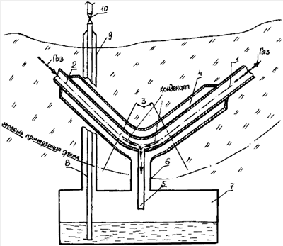 Устройство состоит из наклонных восходящего 1 и нисходящего 2 участков газопровода и колена 3, которые размещены в охватывающем канале 4. В нижней части соединительного колена 3 выполнен сливной конденсатопровод 5, расположенный в воронкообразном охватывающем канале 6 и соединен с накопительной емкостью 7, при этом в накопительной емкости 7 размещен трубопровод отвода конденсата 8, соосно укрепленный в вертикальном охватывающим канале 9 и имеющий вентиль 10 для сбора конденсата.