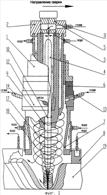 на собранное стыковое соединение свариваемого изделия 19, с заходными и выходными пластинами устанавливается защитный башмак 8, в отверстие башмака вводят сопло 7 сварочной горелки, совмещая ось электрода 4 с осью стыка изделия. Глубину заглубления электрода устанавливают с помощью индикатора, размещенного в корпусе горелки (на фиг. не показан). По команде «Пуск» производится одновременная подача газов в горелку через штуцера 11, 13, 14, 15 и 16 и в башмак 8 (не показан). После продувки, касанием электрода 4 с изделием 19, зажигается дуга, и начинает формироваться сварочная ванна расплавленного металла с последующим погружением и движением электрода 4.