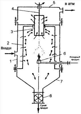 Сушильный агент с заданной температурой и влажностью поступает в свободное пространство между стенками корпуса 1 и обечайки 2. Под действием давления, создаваемого, например, вентилятором, сушильный агент проникает через поры стенок обечайки внутрь ее, здесь происходит тепломассообмен между газом и каплями или частицами, непрерывно подаваемыми через распылитель 6. Оседание капель или частиц на стенки обечайки предотвращается путем организованного отдува их от стенок сушильным агентом, поступающим через поры. Отработанный теплоноситель проходит через поры вращающегося полого пористого цилиндра 3, а частицы, приблизившиеся к поверхности цилиндра, попадают во вращающийся пограничный слой, формирующийся у его поверхности, и под действием центробежных сил отбрасываются снова в объем обечайки и выводятся из аппарата. Отделившийся от частиц теплоноситель через пространство под верхней крышкой 5 покидает аппарат.