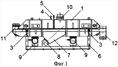 Сушильная установка с виброкипящим слоем включает в себя сушилку вибрационную конвективную типа СВК, которая состоит (см. фиг.1 и 2) из рабочего органа 1 в виде протяженной герметичной оболочки, состоящей из двух частей: крышки, жестко соединенной с лотком, причем в плоскости, перпендикулярной оси рабочего органа 1, крышка имеет профиль, образованный внутренней и внешней полуокружностями, а лоток имеет профиль криволинейной трапеции, с большим внешним основанием, равным по величине с диаметром внешней полуокружности крышки. Внутри рабочего органа 1 расположен горизонтальный перфорированный лист 2. Лоток посредством упругой системы 3 базируется на раме 6. Вибровозбудитель 8 закреплен на кронштейнах 7, связанных с нижней частью лотка. Кроме того, на рабочем органе 1 установлены патрубки загрузки 11 и выгрузки 12 продукта и патрубки подачи 9 нагретого теплоносителя (воздуха) и его отсоса 10, а на крышке установлены патрубки 4 и 5 соответственно для подключения к системам мойки и пожаротушения (на чертеже не показано).